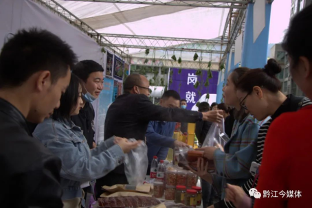 今天是周末,有著“黔江解放碑”之稱的大十字購物廣場人頭攢動,熱鬧非凡一場特殊的招聘會和展銷會在這里舉行。